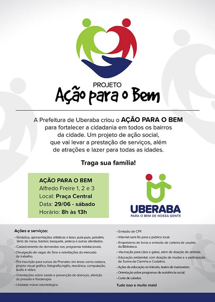 A Prefeitura Municipal de Uberaba realizará neste sábado (29), o Projeto Ação para o Bem, das 8h às 13h, na praça central do bairro Alfredo Freire. Durante o evento as secretarias da prefeitura estarão realizando diversas ações para toda a comunidade.